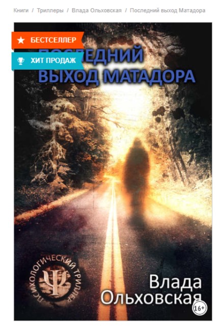 18 декабря на портале электронных книг ЛитРес стала доступна для скачивания книга Влады Ольховской «Последний выход Матадора«. Психологический триллер стал пятой книгой в серии о Леоне Аграновском и Анне Солари. В 2019 году серия была отмечена премией «Бегущая по волнам» за лучший женский образ в художественной литературе.