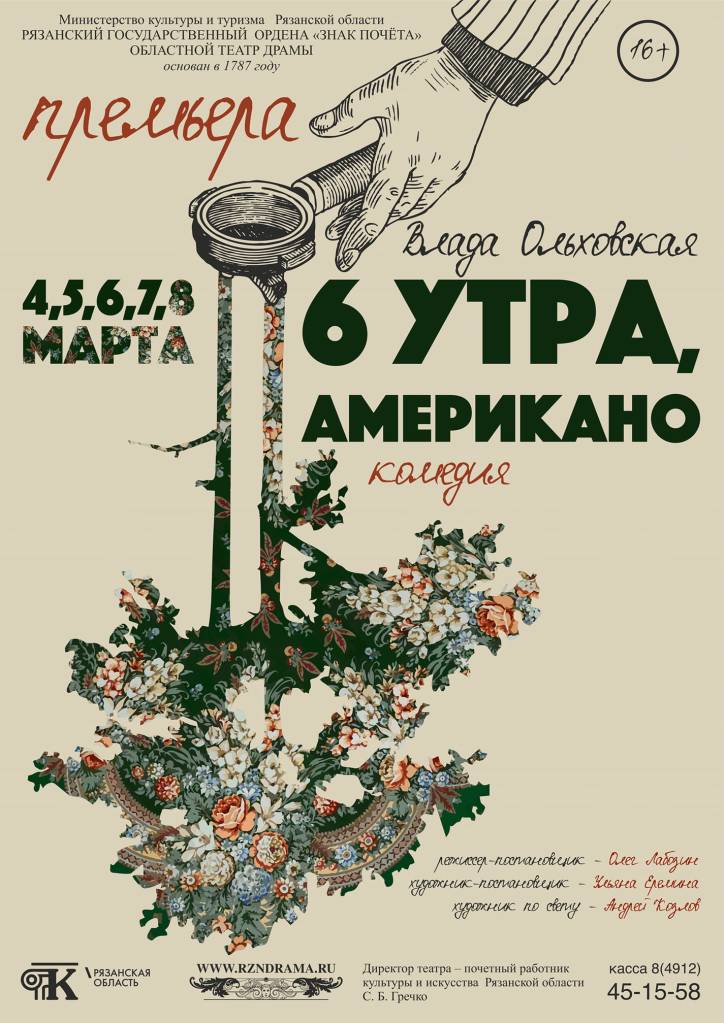 4, 5, 6, 7 и 8 марта в Рязанском Государственном Областном Театре Драмы состоятся премьерные показы комедии «6 утра, американо» по пьесе Влады Ольховской.